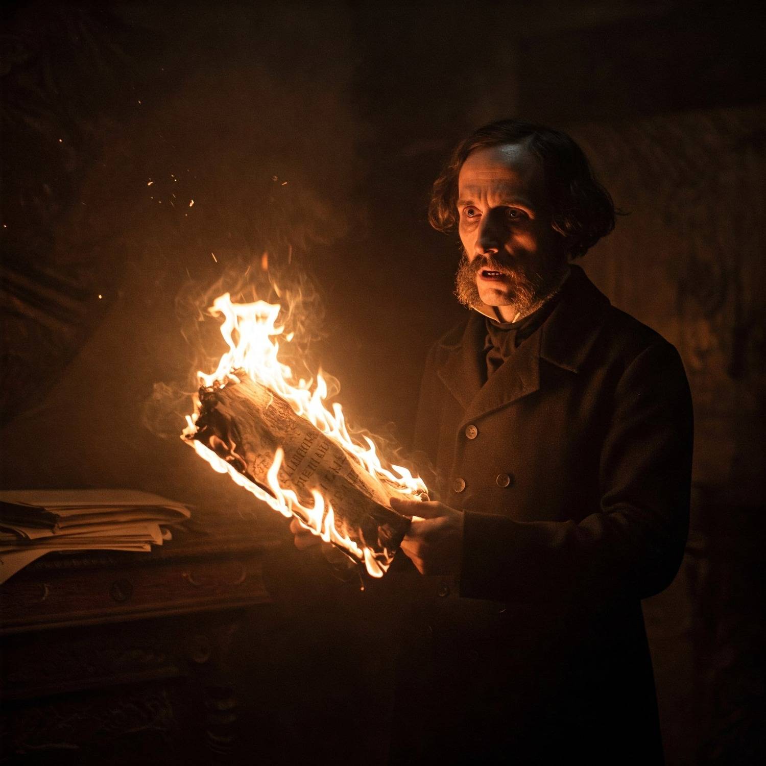Образ, который давно стал символом — но никто не знает, как это выглядело. Здесь — мрак комнаты, испуг, решимость, огонь, поедающий страницы. Художественно, драматично, почти театрально — и в то же время пугающе правдоподобно. Есть предположения, что это за автор?