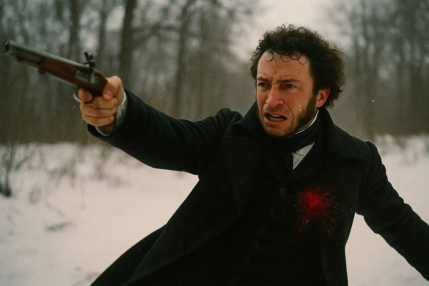 Наверное, это самая очевидная работа. Слишком уж характерные кучерявые волосы и бакенбарды. Но сцена здесь выглядит как стоп-кадр из масштабного исторического фильма: адреналин, снег, последняя вспышка эмоций. Конечно, фотографов тогда не было — но нейросеть воссоздает момент вполне убедительно.